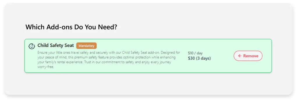 Add custom add-ons like insurance, delivery fees, additional drivers and fuel options.